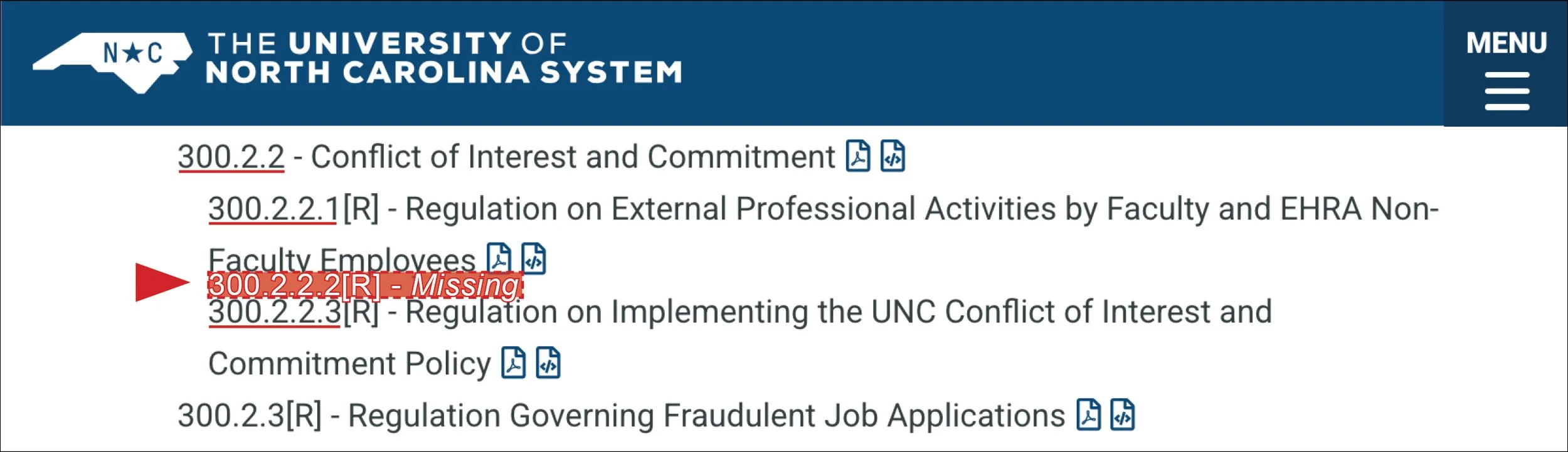 Following this response, the policy disappeared from the index of the UNC Policy Manual and Code, the governing policy document for the UNC System.