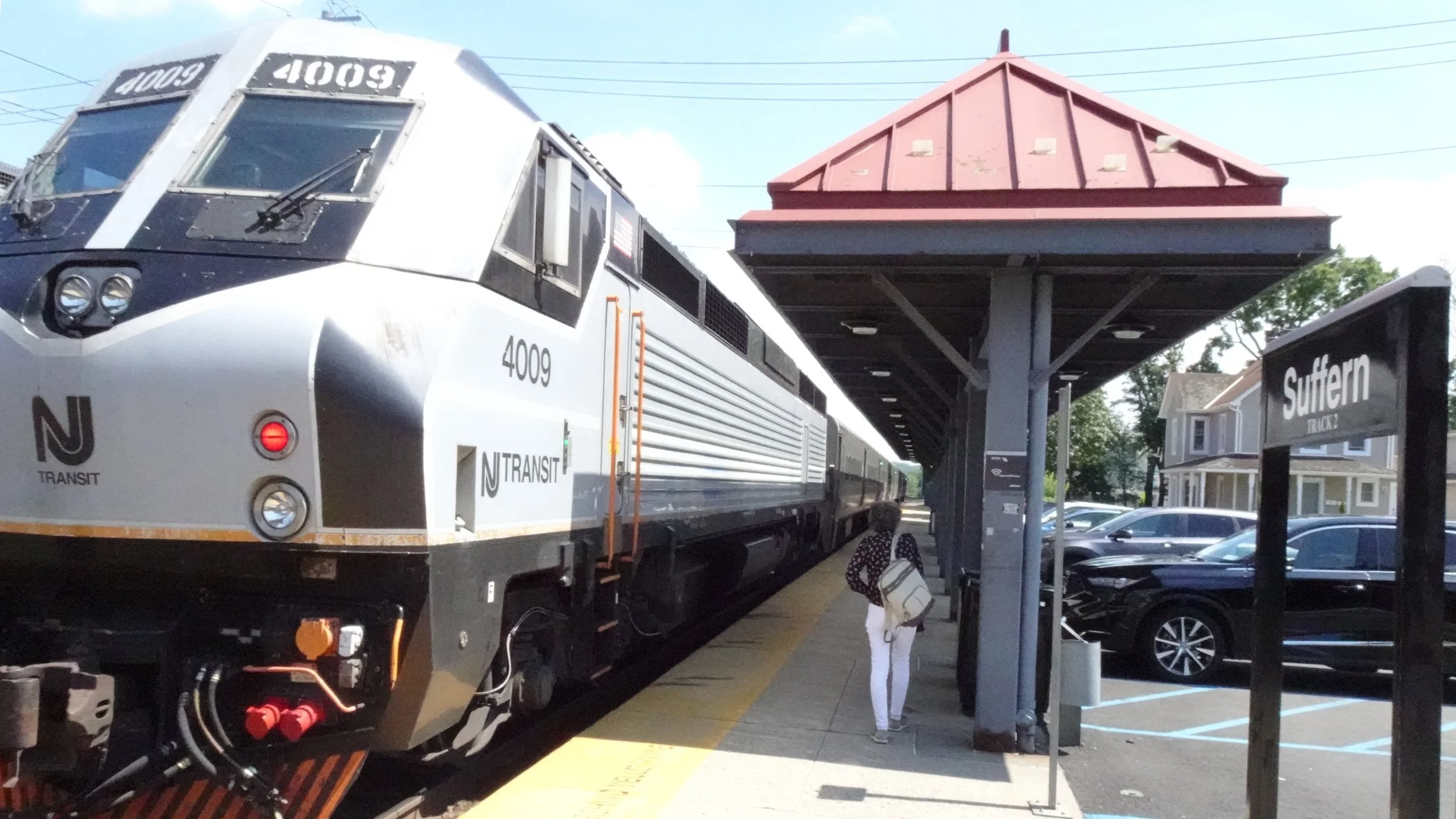 Metro-North-branded street signage points to Suffern Station, where Metro-North riders purchase tickets from an NJ Transit kiosk.